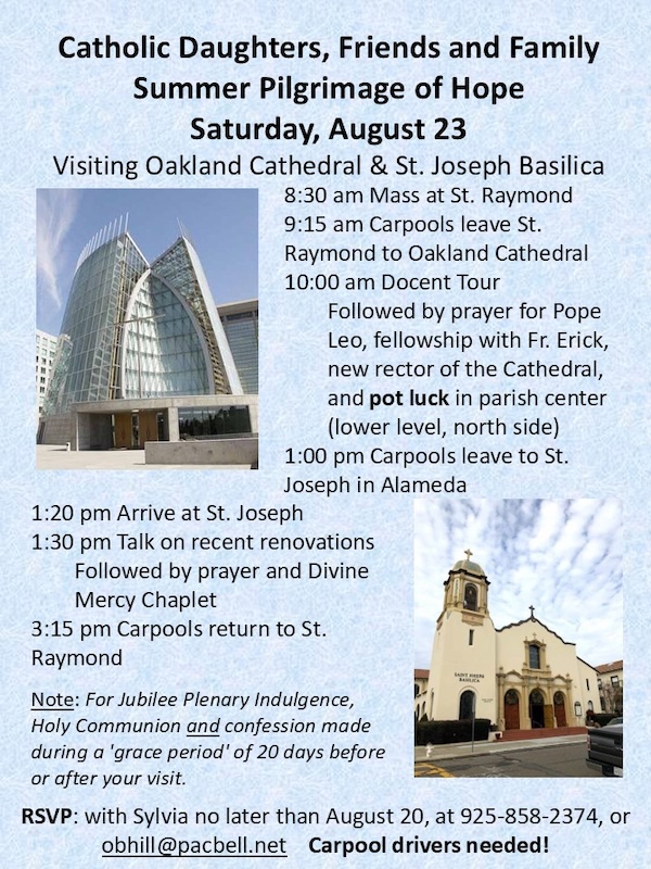 A visit to the Cathedral of Christ the Light & St. Joseph Basilica on Saturday, August 23 includes Mass, prayers, fellowship with Fr. Erick and pot luck. Carpool from St. Raymond. See flyer for note on Jubilee Plenary Indulgence.