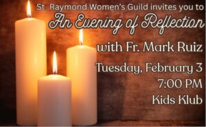You’re invited to An Evening of Reflection with Fr. Mark on February 3, hosted by the Women’s Guild. When: Feb 3 at 7:00PM Where: Kids Klub