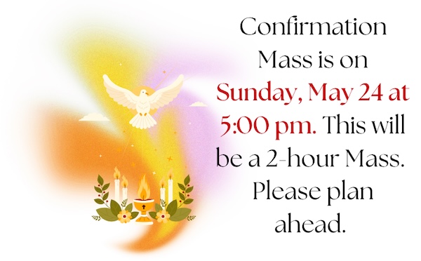 The Confirmation Mass on Sunday, May 24th, 5:00 PM, will be a 2-hour Mass.