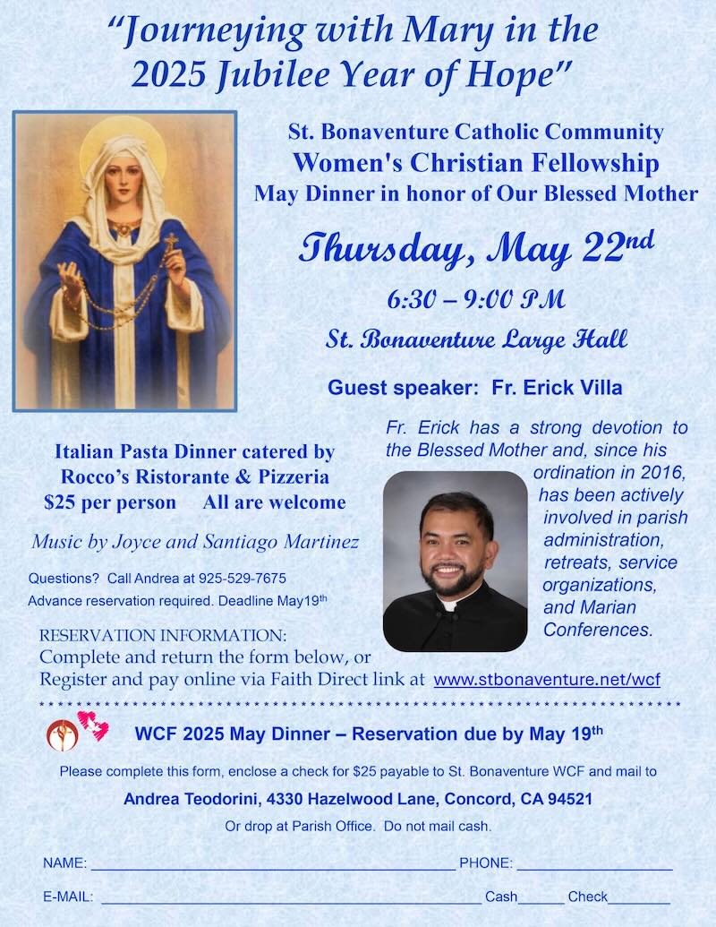 The Women’s Christian Fellowship hosts a May dinner in honor of Our Blessed Mother at St. Bonaventure on Thursday, May 22, with guest speaker Fr. Erick Villa. RSVP by May 19th.
