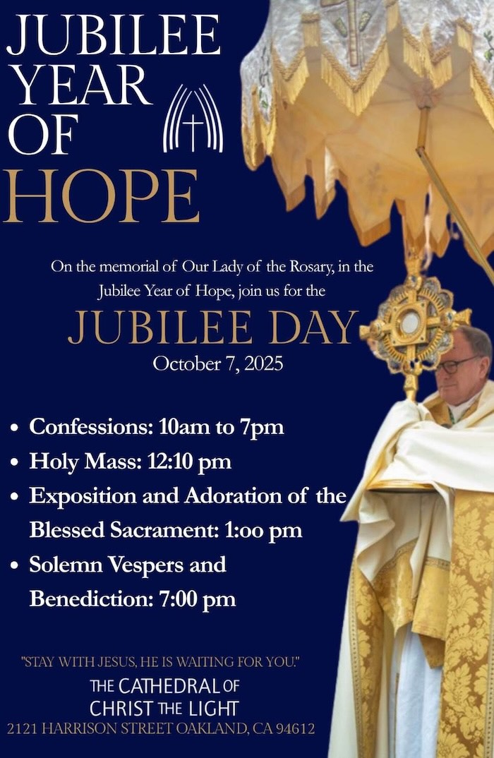 In the Diocese of Oakland, the Cathedral of Christ the Light, Oakland and Mission San Jose in Fremont are permanently designated sites for every day of the 2025 Holy Year. Pilgrims may come as individuals, or arrange group pilgrimages with their parish, school, or clubs: Catholic Daughters of the Americas, Knights of Columbus, confirmation classes, Divine Mercy and youth groups, Legion of Mary, Cursillo and charismatic prayer groups, etc.