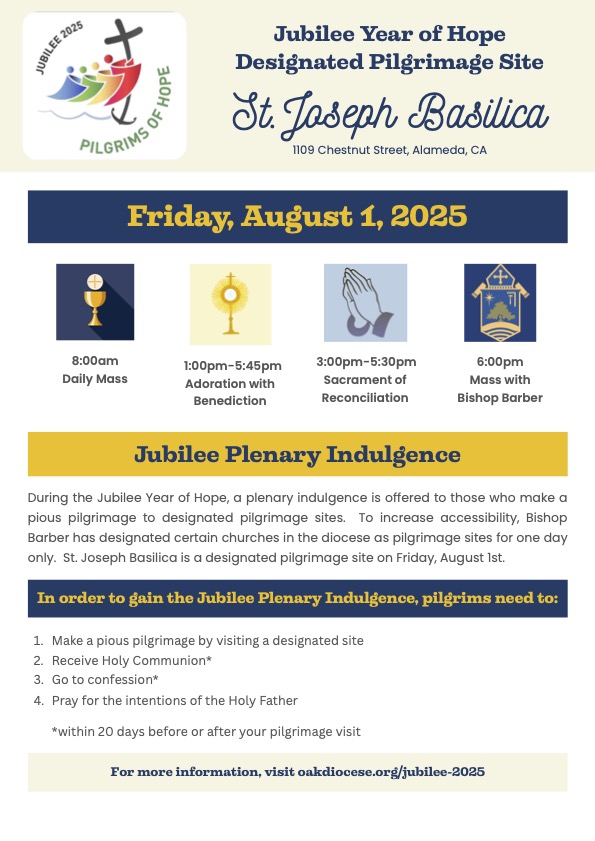 In the Diocese of Oakland, the Cathedral of Christ the Light, Oakland and Mission San Jose in Fremont are permanently designated sites for every day of the 2025 Holy Year. Pilgrims may come as individuals, or arrange group pilgrimages with their parish, school, or clubs: Catholic Daughters of the Americas, Knights of Columbus, confirmation classes, Divine Mercy and youth groups, Legion of Mary, Cursillo and charismatic prayer groups, etc.