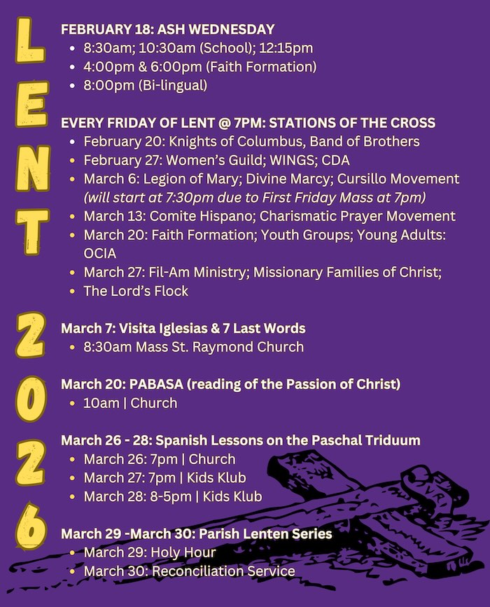 February 18 is Ash Wednesday. Mass schedule and distribution of ashes as follows: