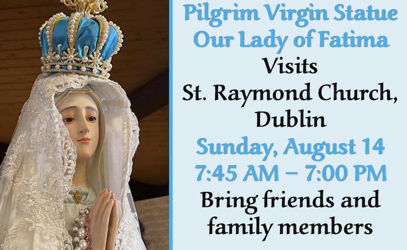 Visit the pilgrim image of Our Lady of Fatima on August 14th at St. Raymond from 7:45 AM – 7:00 PM. You are invited to experience our Blessed Mother’s tender love up close and personal. Bring friends and family members