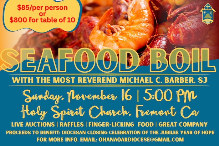 Join the Seafood Boil Dinner with Bishop Barber on November 16 at 5PM at Holy Spirit Church in Fremont. Proceeds will benefit the Diocesan Closing Celebration of the Jubilee Year of Hope. For more info, email ohanaoakdiocese@gmail.com