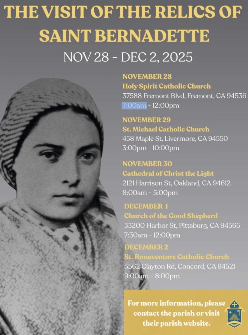 The Relics of St. Bernadette will visit various churches in the Diocese of Oakland. On November 30, the relics will be at the Cathedral of Christ the Light in Oakland, from 8AM to 5PM. Please see flyer for schedule of visits.