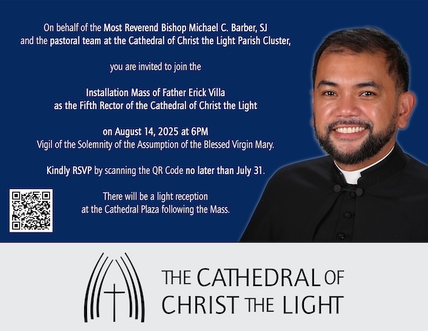 You are invited to join the Installation Mass of Fr. Erick Villa as the 5th Rector of the Cathedral of Christ the Light on August 14th at 6PM.
